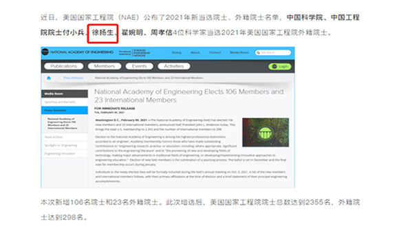 據悉:當地時間2月9日,美國國家工程院發布通知,(NAE)公布2021年新當選院士、外籍院士名單,本次 新增106名院士和 23名外籍院士。此次增選后,美國國家工程院院士總數達到 2355名,外籍院士達到 298名。其中,中國科學院、中國工程院院士徐揚生入選!