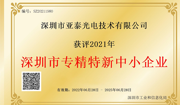 喜訊|深圳亞泰光電獲得深圳市“專精特新”企業(yè)榮譽(yù)稱號(hào)!