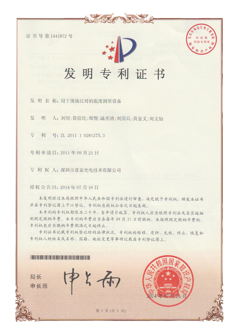 亞泰光電首頁 >> 走進(jìn)亞泰 >> 亞泰光電資質(zhì)榮譽(yù) >> 發(fā)明專利 >> 用于現(xiàn)場比對的溫度測量設(shè)備