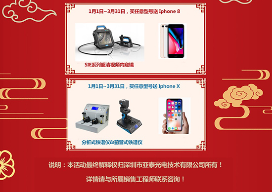 在過去的一年里,在亞泰人的共同努力下,我們?nèi)〉昧烁蟮某煽儯瑏喬┕怆姲偃f像素內(nèi)窺鏡在國內(nèi)外市場進(jìn)一步拓展,經(jīng)銷商簽約量屢創(chuàng)新高,產(chǎn)品得到了國內(nèi)外市場的認(rèn)可和客戶一致好評;油液事業(yè)部的油液監(jiān)測項(xiàng)目和眾多大型企業(yè)、高校有了更深入的合作,客戶的滿意是對亞泰人最好的獎勵,新年伊始,為回饋新老客戶對亞泰光電多年來的支持,亞泰光電新春送福送紅包,購儀器享豪禮!我們相信在亞泰人共同努力下,亞泰光電2018更上一層樓,亞泰光電愿與您一起共同攜手,共贏、共榮、共發(fā)展!