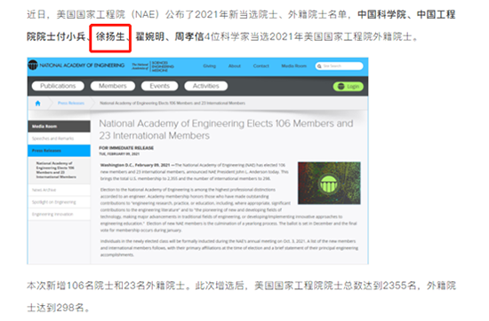 據(jù)悉:當(dāng)?shù)貢r(shí)間2月9日,美國(guó)國(guó)家工程院發(fā)布通知,(NAE)公布2021年新當(dāng)選院士、外籍院士名單,本次 新增106名院士和 23名外籍院士。此次增選后,美國(guó)國(guó)家工程院院士總數(shù)達(dá)到 2355名,外籍院士達(dá)到 298名。其中,中國(guó)科學(xué)院、中國(guó)工程院院士徐揚(yáng)生入選!