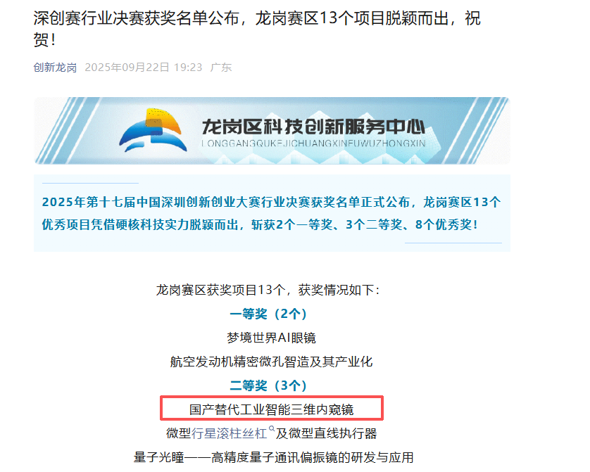 近日,第十七屆中國深圳創新創業大賽總決賽圓滿落幕,賽場傳來振奮人心的喜訊!深圳亞泰光技術有限公司憑借其自主研發的“國產替代工業智能三維內窺鏡”項目,在眾多頂尖科創項目中一路過關斬將,最終勇奪大賽亞軍,榮獲二等獎的優異成績!這一榮譽不僅是對亞泰光技術實力的權威認證,更標志著我國在高端工業無損檢測裝備領域實現重要突破。