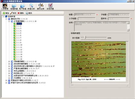 軟件包含:?員管理,標準鐵譜管理,??鐵譜管理,鐵譜分析,操作記錄管理.系統設置6個部分??梢詫﹁F譜圖?進?實時的采集、 對?、測距、分析完畢可以把分析結果保存,并且以報表的形式打印出來或者保存為PDF?件。