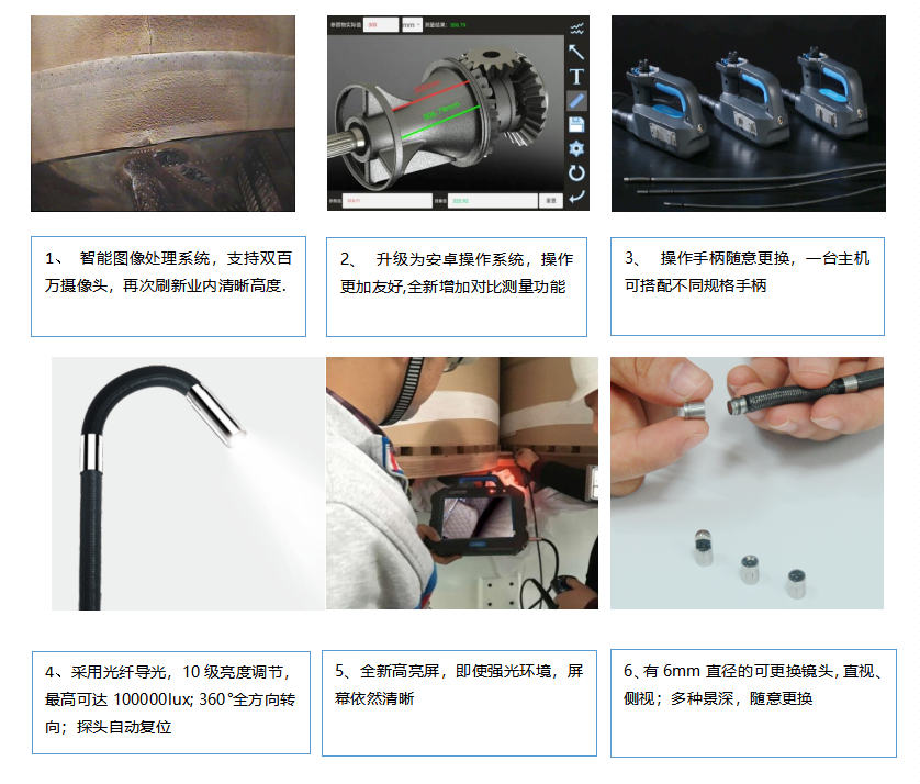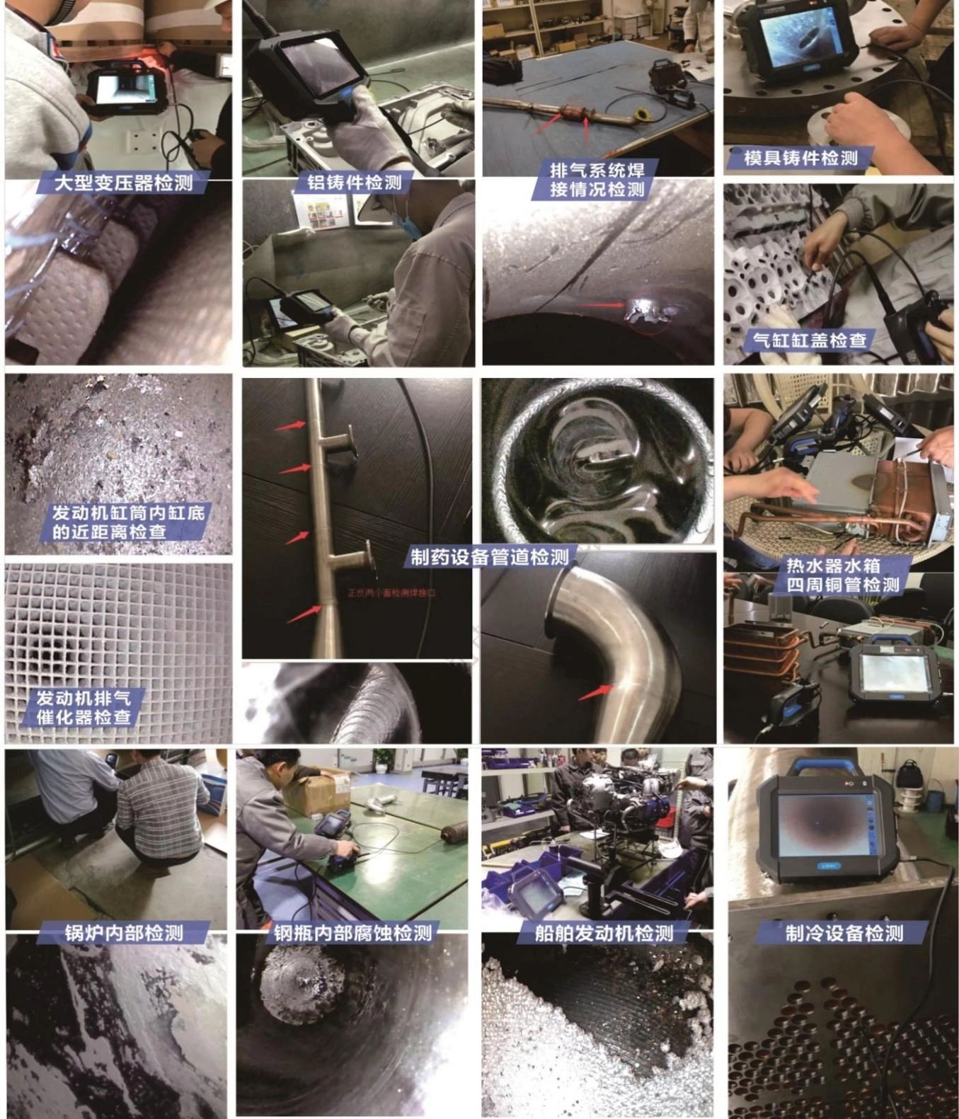 本儀器廣泛應用于航空、汽車、船舶、電氣、化學、電力等現代核心工業生產、檢修等多個環節。具有直接可視的特點,能夠直接觀測管道、渦輪、汽缸、發動機等大型裝置內表面是否存在缺陷或異狀。可進行實時拍照和視頻錄制,為分析設備使用狀況及設備生產保障提供不可或缺的數據采集。