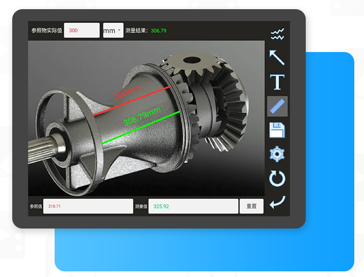 支持點到點,點到線,點到面,多線段,周長,深度, 面積等測量模式。對缺陷的分辨力優于 0.03mm,缺陷測 量結果與缺陷實際大小誤差小于 5% |